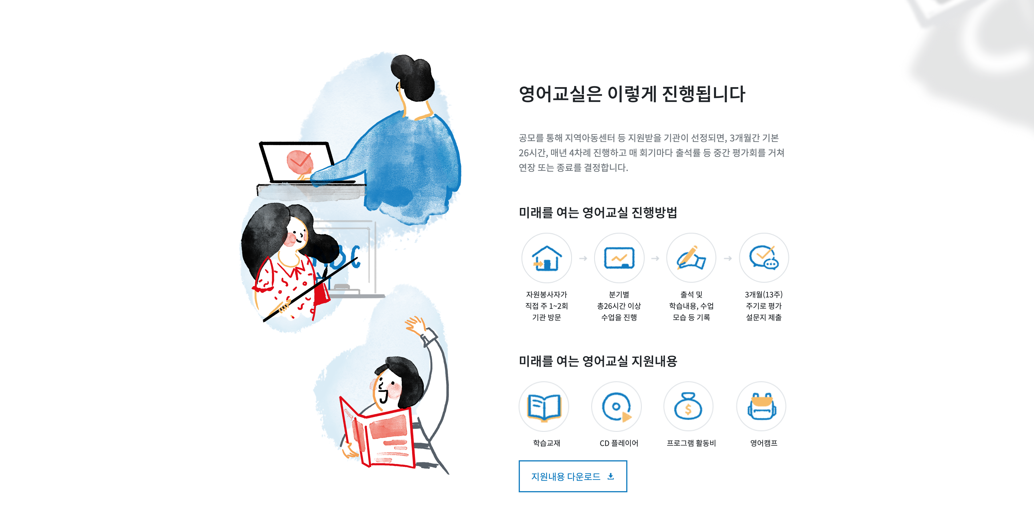 영어교실 홈페이지는 지역아동센터 선생님들이 많이 사용해요. 10년 동안 크고 작은 변화 없이 사용하던 사이트가 완전히 새롭게 바뀌었는데도 큰 거부감 없이 받아들이고, 불편없이 사용하시는 것 같아요. 종종 사이트가 예쁘다는 말씀도 듣고있어요! 또, 신규 기관 지원을 많이 하도록 독려하고 있는데, 그분들이 처음 영어교실 홈페이지를 들어왔을 때 전보다 더 쉽고 효과적으로 다양한 관련 정보에 접근하실 수 있게 되어 만족스러워요.