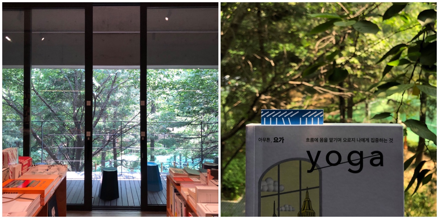 슬로워크의 마케팅 라이터답게 누들은 야외 테라스에서 책을 읽었어요. 도심 속 자연이라니, 힐링의 분위기가 느껴지지 않나요? 누들은 평소 취미로 요가를 즐기는데, 때마침 푸른 자연을 느끼며 책을 읽을 수 있는 공간과 요가책이 있더라고요. 찰떡궁합이죠!