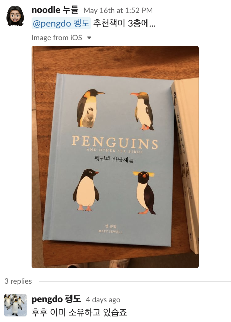 3층 서점에서 펭도의 맞춤형 책도 찾았답니다. 바로 ‘펭귄 책!’ 하지만 이미 소유하고 있다는 펭도의 말에 웃음이 한바탕 터졌네요. (프로필 사진도 펭귄인 거 보이나요? 😁)