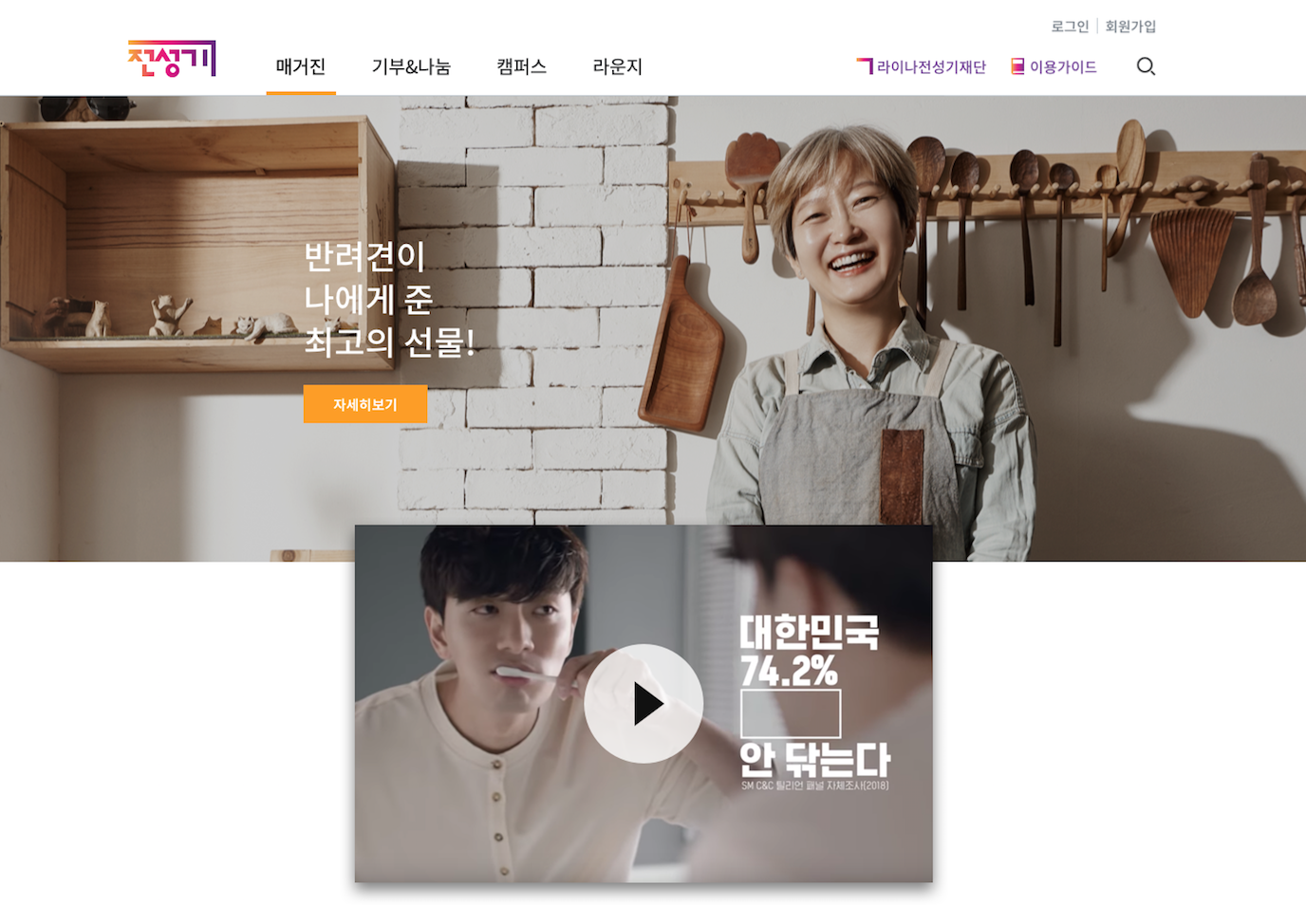 ‘기부&나눔’ 카테고리는 50+세대의 사회 활동을 보여줍니다. 일상에서 실천할 수 있는 기부 캠페인을 페이지 맨 위쪽 전면에 배치해 보기 쉽게 만들었습니다. 이 외에 벼룩시장, 1:1 나눔/거래 플랫폼도 제공합니다. ‘캠퍼스’에서는 교육 강좌와 온라인 커뮤니티를 제공합니다. 전성기 캠퍼스의 기능을 새로운 사이트에도 담은 것이지요. 마지막으로 ‘라운지’는 전성기 회원들이 서로 정보를 주고받는 공간입니다. 반려동물 관련 정보를 나눌 수 있는 게시판인 펫방, 건강 지수 확인 페이지, 이벤트, 공지사항으로 구성됐습니다.