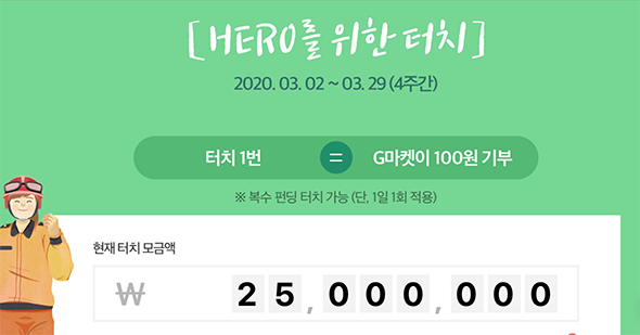지마켓 로그인 후 펀딩 버튼을 클릭만 하면 100원씩 모금되어, 소방 구급 대원들의 외상 후 스트레스 장애 치료를 위한 심리 상담 프로그램에 지원하는 기부 크라우드 펀딩 프로젝트입니다. 고객 비용이 아닌, 지마켓에서 전액 기부하는 방식으로 기부가 생소한 사람들에게도 부담 없이 기부 문화를 경험할 수 있게 했다는 점에서 의미가 있어요.