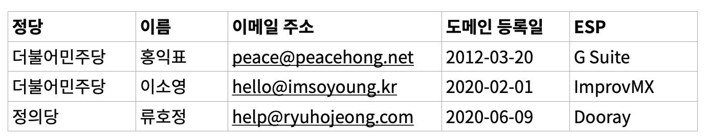 21대 초선 의원 중에서 국회 이메일을 기입한 의원의 숫자입니다. 더불어민주당 신영대 의원, 정정순 의원, 그리고 미래통합당 전봉민 의원만이 국회에서 제공하는 이메일 주소를 기입했습니다. 이들이 국회 이메일을 사용하는 것을 보면 국회 사무처에서 이메일 계정 안내를 한 것 같기는 합니다.