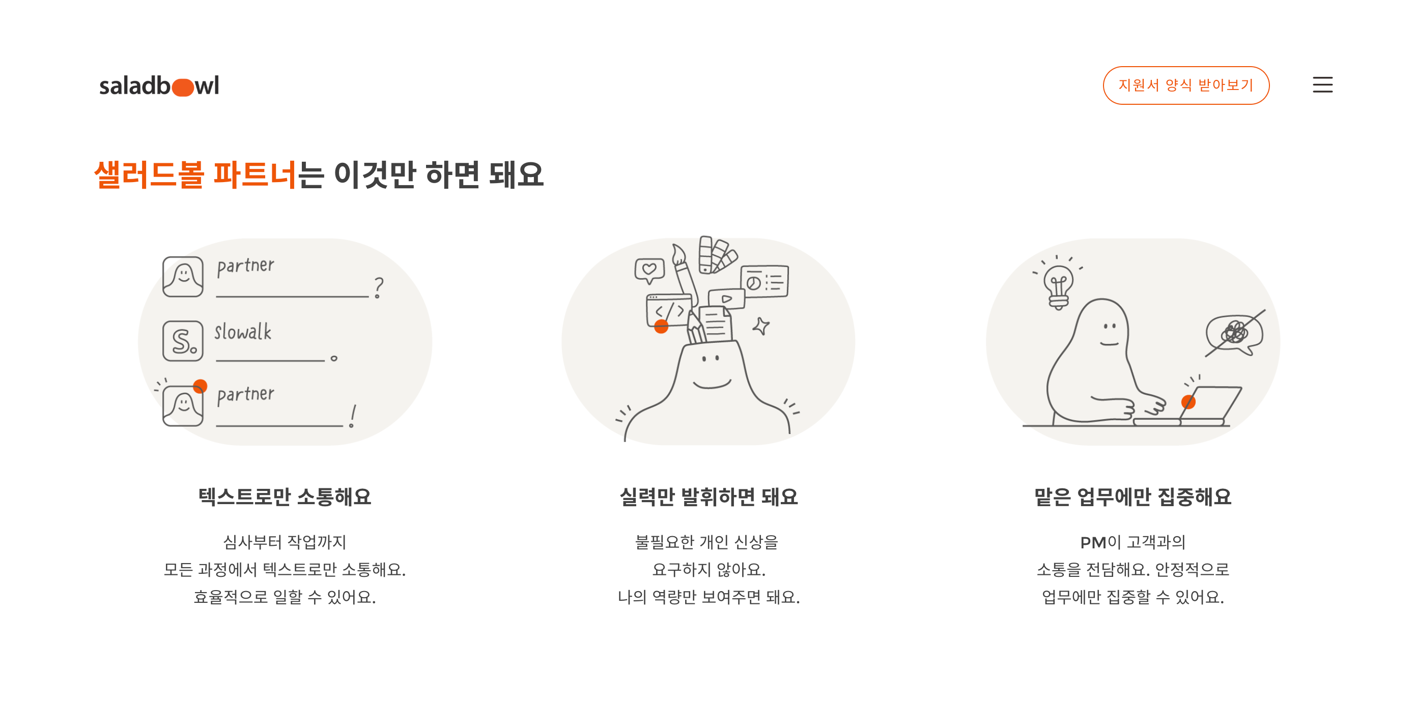 그런 측면에서 프리랜서 및 개인 작업자분들, 우리가 겪고 있는 문제를 일부 해소할 수 있는 방법의 하나일 것 같아요. 너무 고민하지 마시고, 샐러드볼에 지원해보세요~