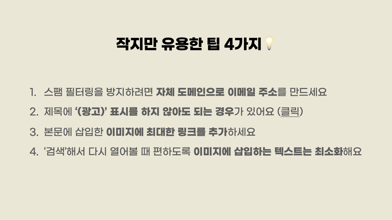 - 스팸 필터링을 방지하려면 Gmail, 네이버메일 같은 무료 주소 말고, 자체 도메인(회사 도메인 등)으로 이메일 주소를 만드세요.