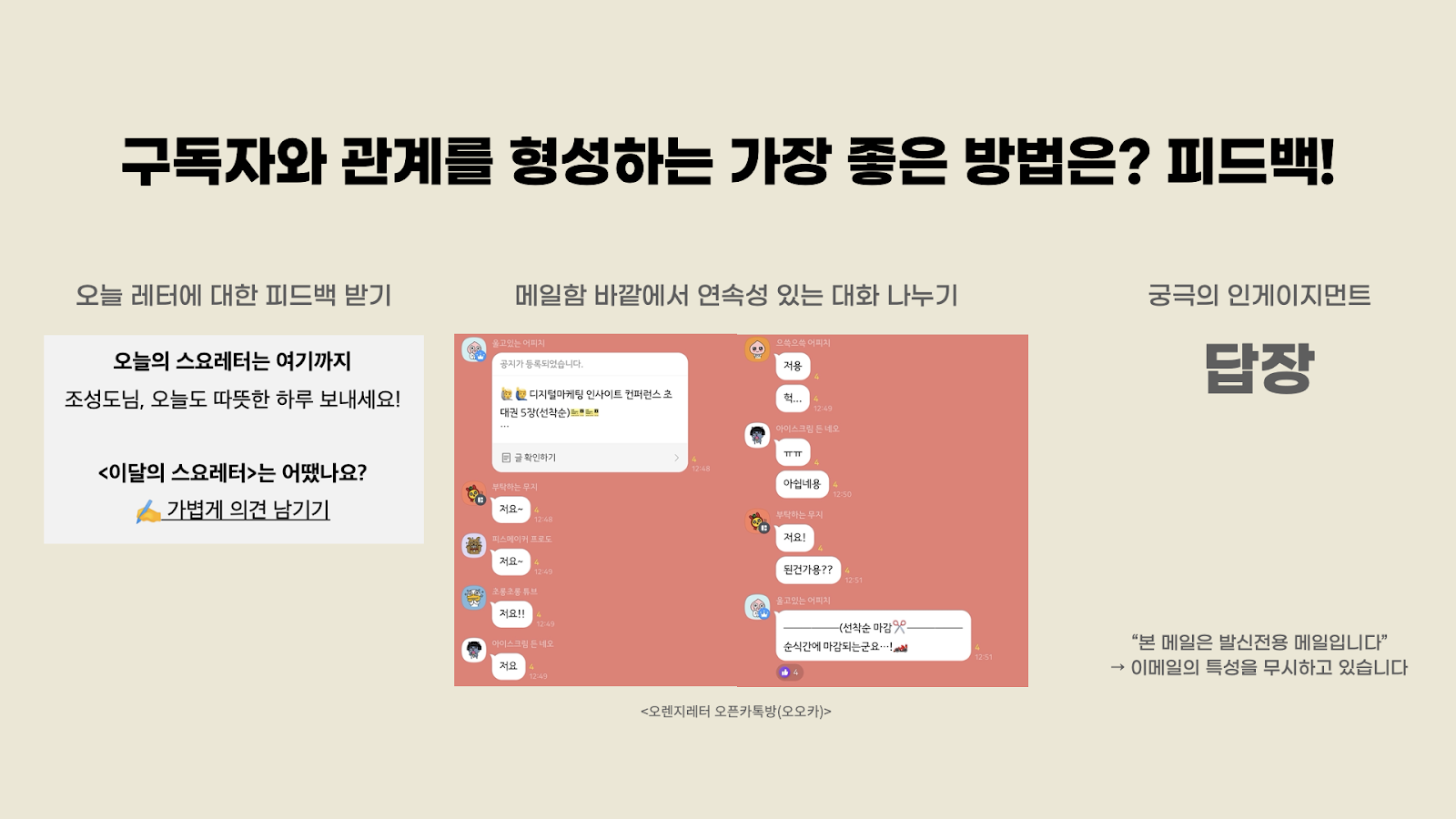 지금까지 8가지 요소에 대한 전략을 자세히 알아봤어요. 그런데 그 무엇보다도 구독자와 관계를 형성하는 가장 좋은 방법은 '피드백'입니다! '스요레터'처럼 메일 본문 링크를 통해서 오늘 레터에 대한 피드백을 받을 수도 있고요, '오렌지레터'처럼 카카오톡 오픈채팅을 통해 메일함 바깥에서 연속성 있는 대화를 나눌 수도 있어요. 궁극의 인게이지먼트는 '답장'입니다. 이메일로 전달되는 것이니 서로 메일을 주고받는 것이 자연스럽습니다. 오렌지레터에도 답장을 보내오는 '찐 독자'분들이 여럿 계세요. 간혹 "본 메일은 발신전용 메일입니다"라고 적힌 뉴스레터를 볼 때마다 이메일의 특성을 무시하고 있어서 안타깝습니다.