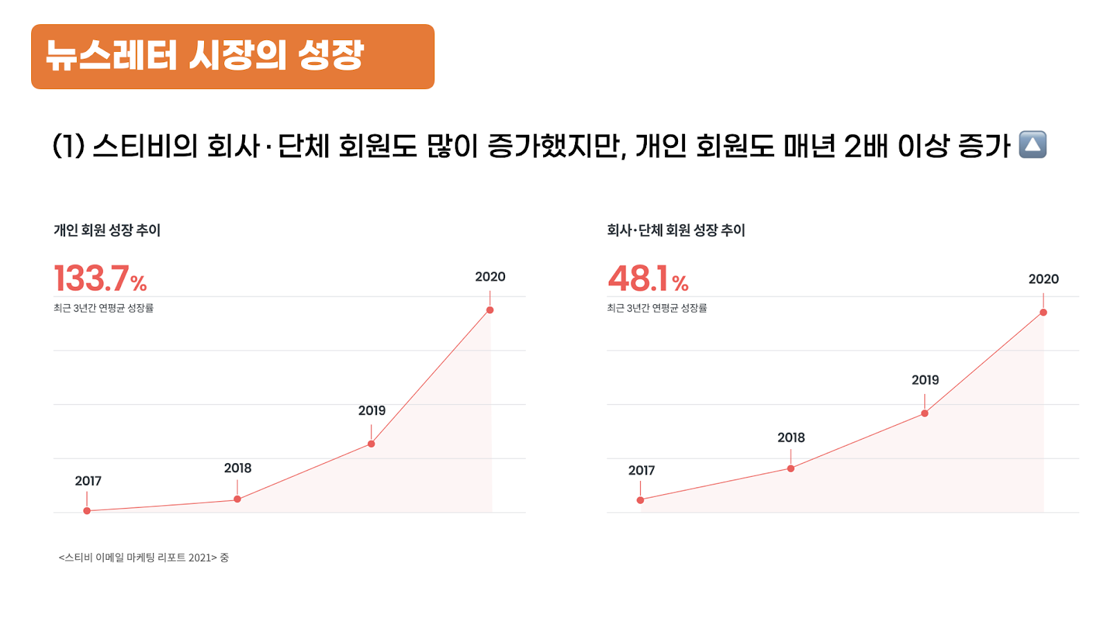 개인 회원은 연평균 133.7%, 회사・단체 회원은 연평균 48.1% 성장하고 있습니다. 회사・단체 회원도 많이 성장했지만 개인 회원이 매년 2배 이상 성장하고 있다는 점이 고무적입니다. 여러분 중에도 스티비로 뉴스레터를 발행하는 분들이 꽤 되실 것으로 생각합니다.