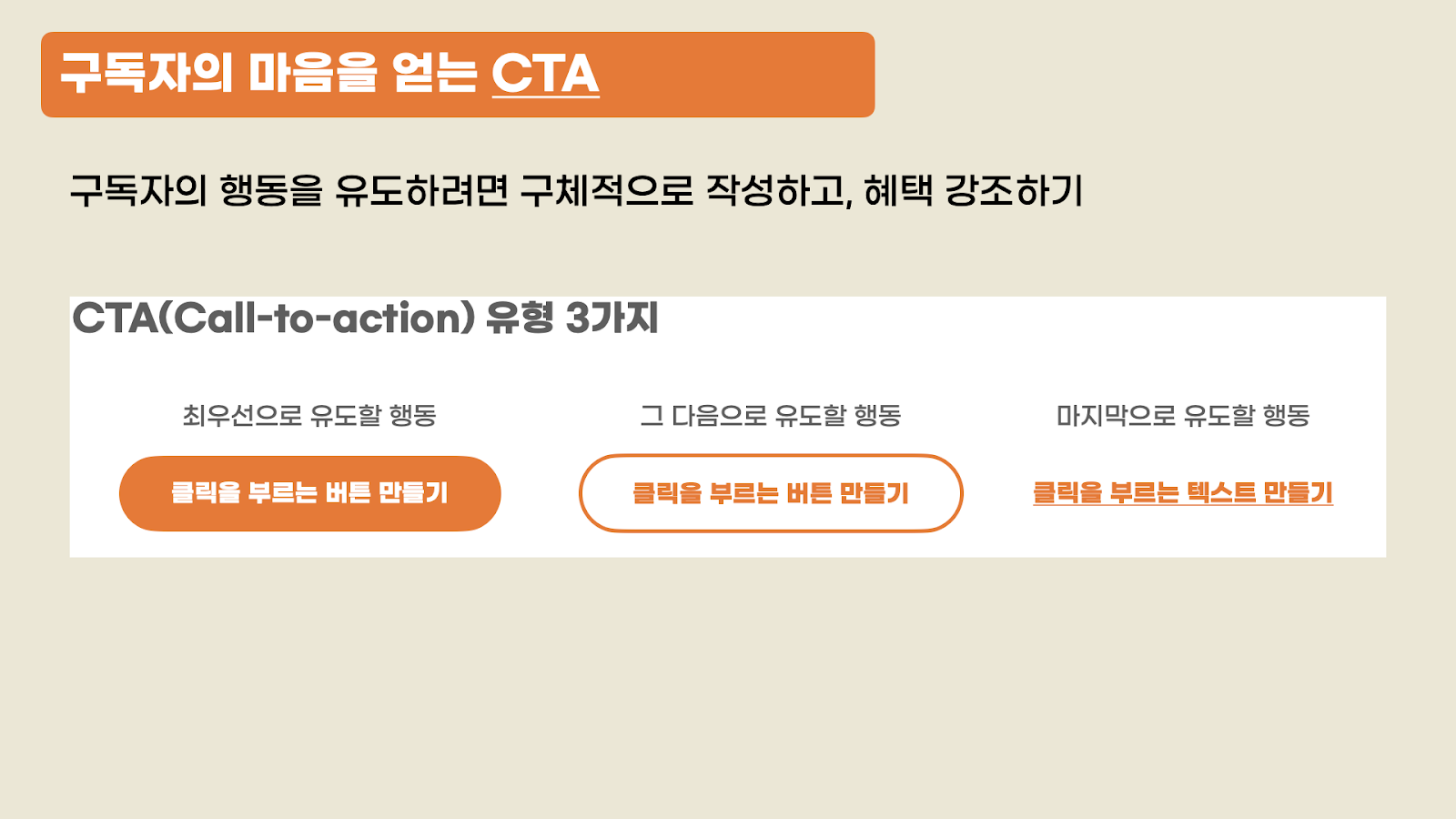 메일 본문에서 가장 눈에 띄는 부분은 어디일까요? 구독자의 행동을 유도하는 CTA(Call-to-action) 부분입니다. CTA 텍스트는 구체적으로 작성하고, 혜택을 강조하는 게 좋아요. '자세히 알아보기' 대신 '클릭을 부르는 버튼 만들기'처럼요. 우선순위에 따라 배경이 채워진 버튼, 배경이 투명한 버튼, 텍스트 링크 순으로 배치해보세요.