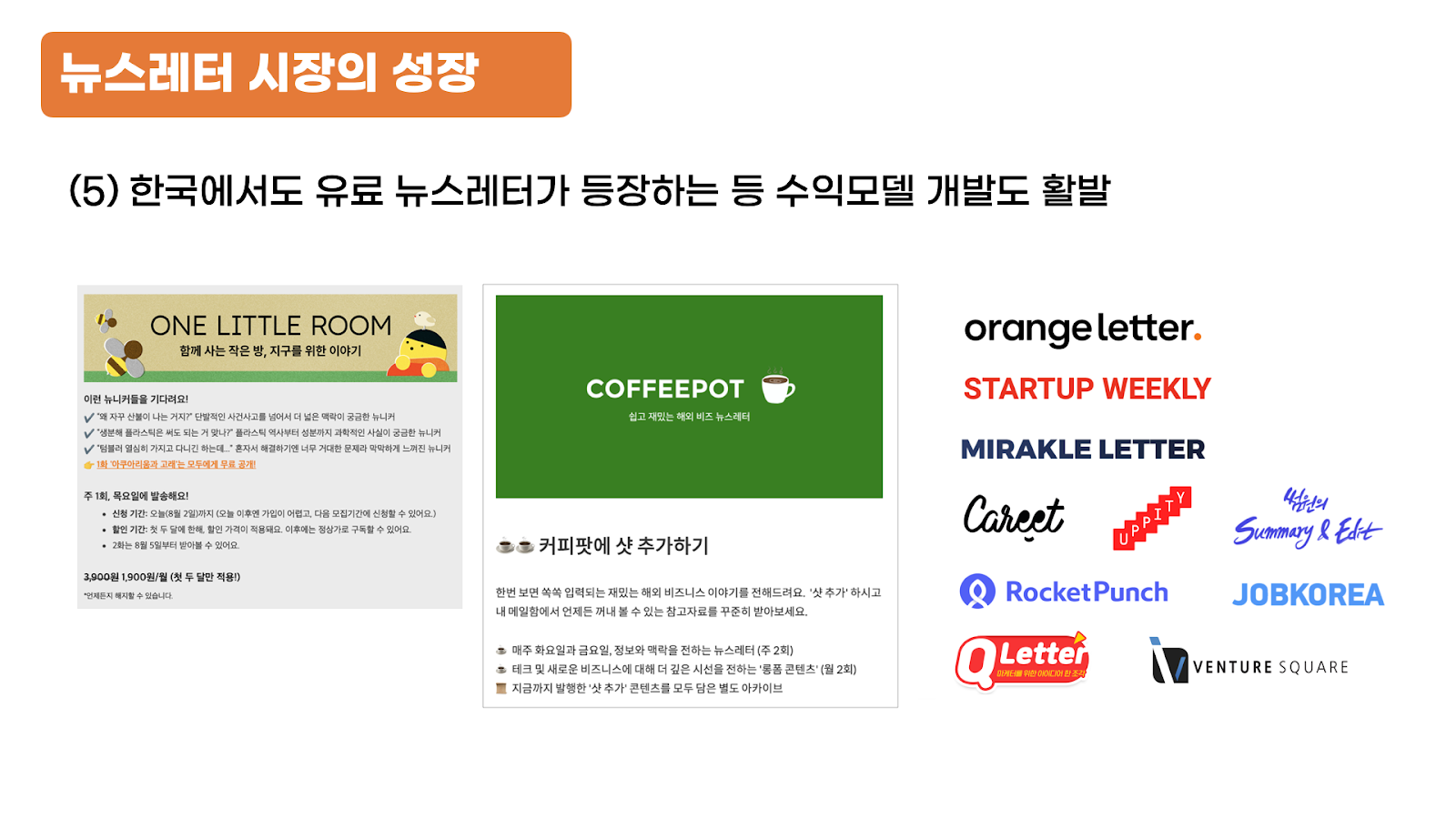 한국에서도 유료 뉴스레터가 등장하는 등 수익모델 개발이 활발합니다. 뉴닉도 '원리틀룸', '주식익힘책' 이런 유료 구독을 실험했고요, 커피팟도 '샷추가'라는 이름으로 유료 구독 콘텐츠를 제공하고 있습니다.
