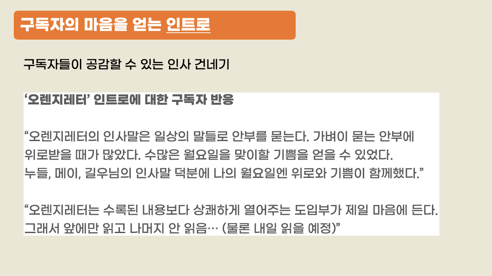 이제 메일 본문으로 들어가 볼까요, 아까 뉴스레터도 인사성이 밝으면 구독자들이 좋아한다고 말씀드렸죠? 처음 구독했을 때뿐만 아니라 메일을 보낼 때마다 인사를 건네는 게 좋습니다. 뉴스레터 인트로를 통해 인사를 건네보세요. 오렌지레터 사례를 참고해보시면 도움이 됩니다.